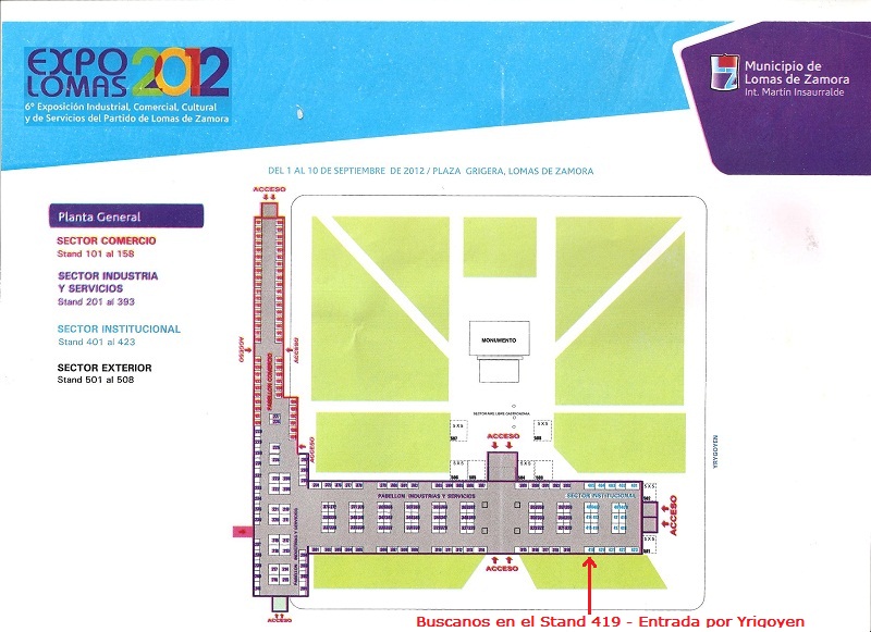 VISITANOS EN NUESTRO STAND (419) en la Feria industrial, comercial, cultural y de servicios de Lomas de Zamora Expolomas 2012. Este año la muestra, que es organizada por el Municipio a través del Instituto Municipal de la Producción, el Trabajo y el Comercio Exterior, se realizará desde el 1 al 10 de septiembre en la Plaza Grigera, ubicada en la avenida Hipólito Yrigoyen al 8700.